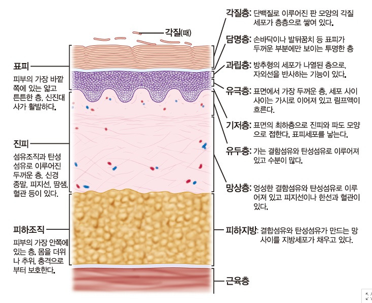 피부는 표피, 진피, 피하조직 세 가지로 이루어진다. 표피는 평균 0.1mm 정도로 대단히 얇고 안쪽에서 바깥쪽으로 기저층, 유극층, 과립층, 담명층, 각질층의 다섯 층으로 나뉜다. 기저층에서는 끊임없이 새로운 세포가 만들어지고 성장하면서 피부 표면으로 올라간다. 그리고 각질층의 표면에 달한 세포는 때가 되면 떨어져 나간다. 세포가 만들어지고 떨어져 나갈 때까지 약 4주의 시간이 걸린다. 표피에는 혈관이 지나지 않고 땀샘과 피지선의 출구와 신경의 말단이 있다.